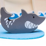 Táto drevená sada pirátskej lode obsahuje všetko, čo malí piráti potrebujú k svojim dobrodružstvám. Balenie zahŕňa kapitána, dvoch pirátov, loď, kotvu, truhlu s pokladom a žraloka. Všetky hracie prvky možno prakticky umiestniť do lode, takže je ideálna pre cestovanie a ľahké prenášanie.