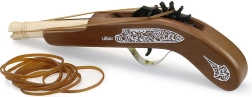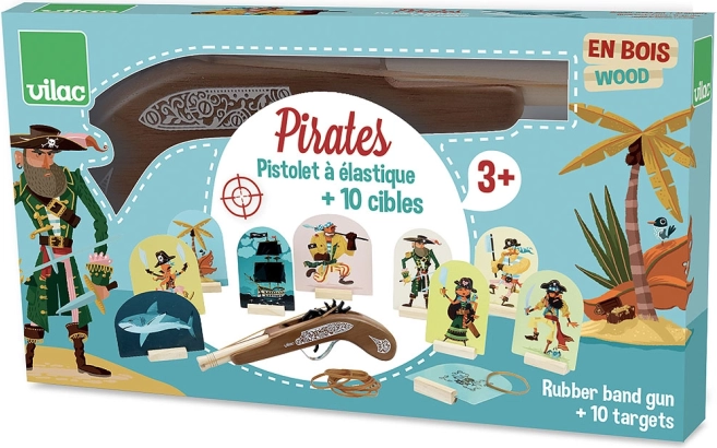 Drevená pirátska pištoľ od značky Vilac je ideálna hračka pre malých nadšencov do pirátskych dobrodružstiev. Umožňuje deťom trénovať streľbu na cieľ pomocou bezpečných gumičiek, ktoré sú súčasťou balenia.