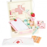 Vďaka realistickým doplnkom ako stetoskop, teplomer, injekčná striekačka, masti a lieky si deti precvičia sociálne zručnosti, empatiu a komunikáciu. Odolné materiály (drevo, textílie a papier) zabezpečujú bezpečnú a dlhotrvajúcu zábavu.