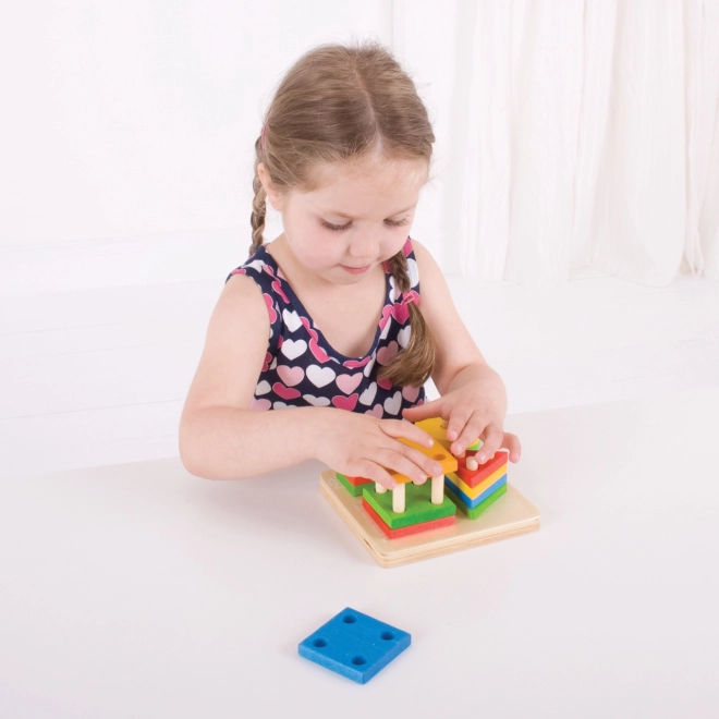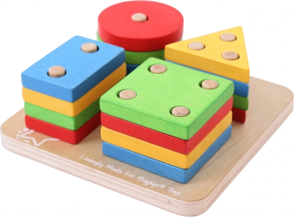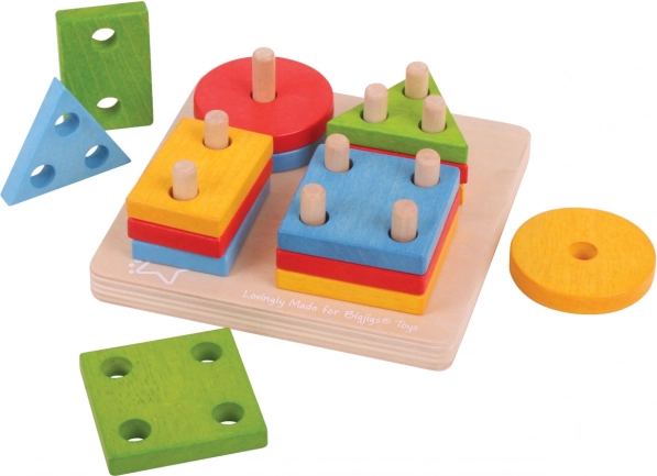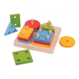 Táto drevená vkladačka so základňou s kolíkmi a pestrofarebnými geometrickými tvarmi (kruhy, štvorce, trojuholníky, obdĺžniky) ponúka deťom radosť z objavovania a učenia. Pri nasadzovaní jednotlivých dielikov si deti precvičia úchop, koordináciu ruka–oko aj logické myslenie, zároveň prirodzene trénujú rozlišovanie farieb a tvarov a prvé počítanie.