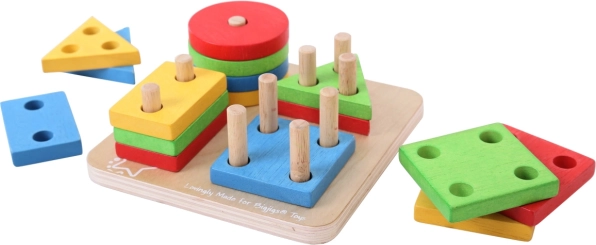 Pestrofarebné kruhy, štvorce, trojuholníky a obdĺžniky podporujú rozlišovanie farieb a tvarov. Kolíky a dieliky pomáhajú s raným počítaním.