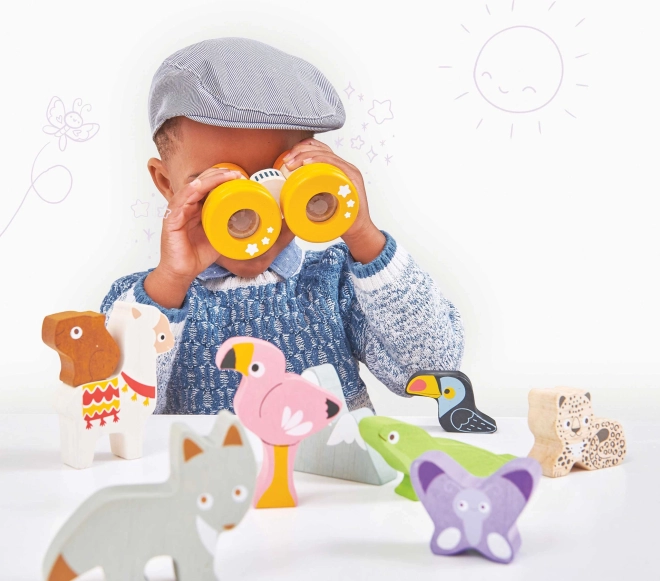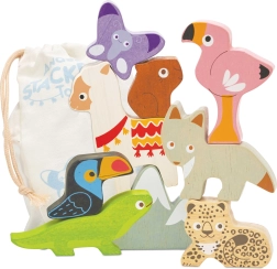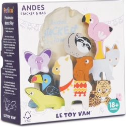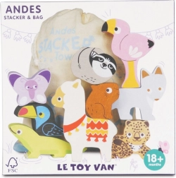 Táto andská skladacia veža prináša deťom dobrodružstvo z hôr priamo do detskej izby. Sada obsahuje robustné drevené figúrky zvierat (napr. lama, plameniak, tukan, jašterica, motýľ, leňochod) a diel hory, ktoré možno stavať, vyvažovať a kombinovať do zábavných zostáv.