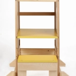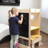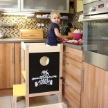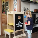 Viacúčelová učiaca veža z kombinácie bukového a smrekového dreva pomáha deťom bezpečne dosiahnuť ku kuchynskej linke či stolu a zapojiť sa do spoločných činností. Vďaka dvom výškovým polohám a premyslenej konštrukcii podporuje samostatnosť, rozvoj motoriky a bezpečie pri každodenných aktivitách. Ľahko ju premeníte na stolík so stoličkou alebo kresliacu tabuľu na kriedy – ideálne na učenie aj hranie.