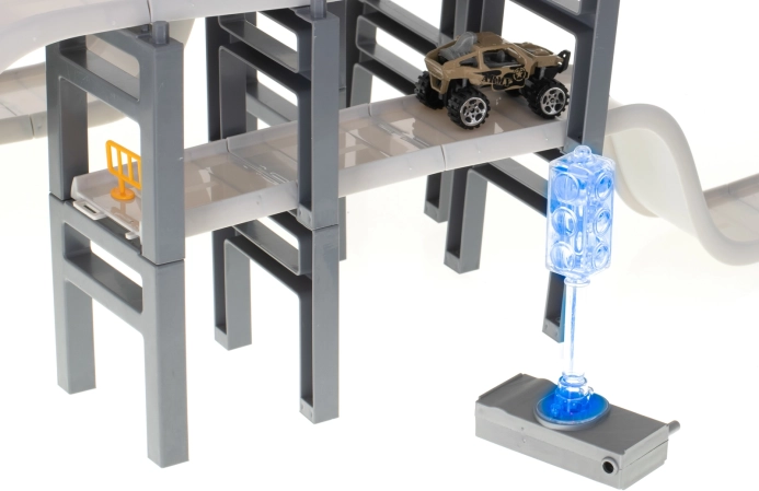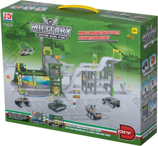 V centre sa nachádza trojpodlažná stavba - parkovisko, ktoré je prepojené komunikáciami s ďalšími úrovňami. Odtiaľ môžete vyjsť priamo na vysokú trať. Postavte naň svoje auto a uvidíte, ako rýchlo zíde až dolu! V hornom poschodí je tiež pristávacia plocha pre vrtuľníky. V prízemí sa nachádza čerpacia stanica s benzínovými čerpadlami, kde si vozidlá môžu doplniť palivo pred ďalším vzrušujúcim dobrodružstvom! V sade nájdete 4 vozidlá vyrobené s veľkým dôrazom na detaily: terénne osobné auto, terénne nákladné auto, terénny transportér, obrnený tank, vrtuľník! Každé vozidlo má pohyblivé kolesá a dokonale reprodukovaný vojenský náter. Vrtuľník má odnímateľné pohyblivé vrtule. Všetky stroje sú v kamuflážnych farbách, ako sa na armádne vozidlá sluší a patrí. S takou sadou je každá vojenská operácia odsúdená na úspech! V estetickom poli nájdete množstvo prvkov terénnej infraštruktúry, ako sú rastliny, značky, semafory, značky alebo bariéry. Súčasťou sady je tiež veľký arch samolepiek, ktoré celú stavbu oživia. Táto sada je skvelou príležitosťou na spoločné trávenie času s rovesníkmi aj s dospelými. Táto hračka umožňuje tvoriť, objavovať, rozvíjať predstavivosť a má pozitívny vplyv na jemnú motoriku vášho batoľaťa.