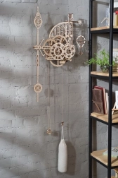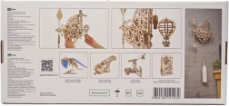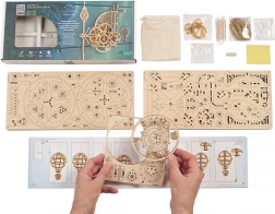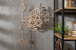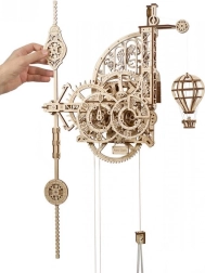 Ugears Aero sú nástenné mechanické hodiny z kvalitnej preglejky, ktoré si sami zostavíte bez lepidla. Fascinujúci pohľad na odhalený hodinový strojček s kyvadlom a závažím sprostredkuje jedinečný zážitok z presného inžinierstva. Čas odčítate z dvojice ciferníkov otáčajúcich sa proti smeru hodinových ručičiek, zatiaľ čo dekoratívny model horúvzdušného balóna pravidelne stúpa a každú celú hodinu sa poklesom pripomenie.