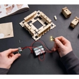 Sada obsahuje 340 presne vyrezaných drevených dielikov a podrobný návod. Skladanie zvládnu aj šikovnejší začiatočníci, model pritom ponúkne dosť výzvy aj pokročilým. Napájanie je riešené voliteľne cez USB‑C alebo 3× AA (nie je súčasťou balenia), takže model ľahko začleníte do akéhokoľvek priestoru.