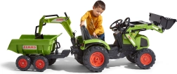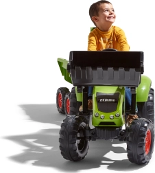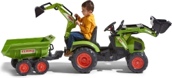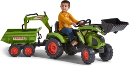 Traktor Claas Axos šliapací – s prednou aj zadnou funkčnou lyžicou + 4-kolesový zelený valník. Z vysoko odolného a kvalitného plastu. Veľkosť 225×60×79 cm. Vek 3+. Všetky traktory Falk sú testované na 50 kg – podľa požiadaviek európskych noriem.