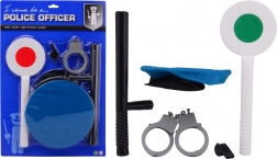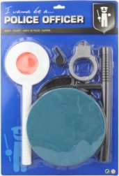 Táto policajná sada poteší všetkých malých strážcov zákona. Obsahuje látkovú čiapku (cca 20 × 20 cm, šilt 23 cm) a plastové doplnky na hru na povolania: plácačku (cca 33 cm), píšťalku, putá a obušok (cca 29,5 cm). Vhodná od 3 rokov.
