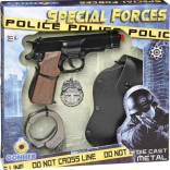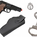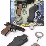 kovová policajná pištoľ, policajný odznak, puzdro na pištoľ, putá