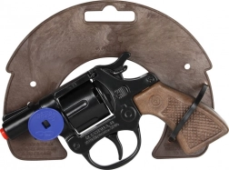 Policajný revolver – kovový, čierny na kapslíky – osem rán. Veľkosť revolvera 13×8,5 cm. Vyrobené v Španielsku.