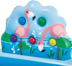 - bazén, šmykľavka, fontána, plameniak, opička, hrošík, krúžok (ringo), 5 loptičiek, opravná záplata, návod, farebné balenie