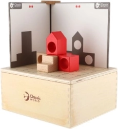 Sada je vytvorená pre deti od 3 rokov a všetky dieliky sú bezpečne uložené v drevenej krabičke o rozmeroch 18,5 x 16 x 9 cm. Deti môžu skúšať zostaviť bloky podľa kariet a zladiť obe strany, čím si precvičujú logiku a zručnosť.