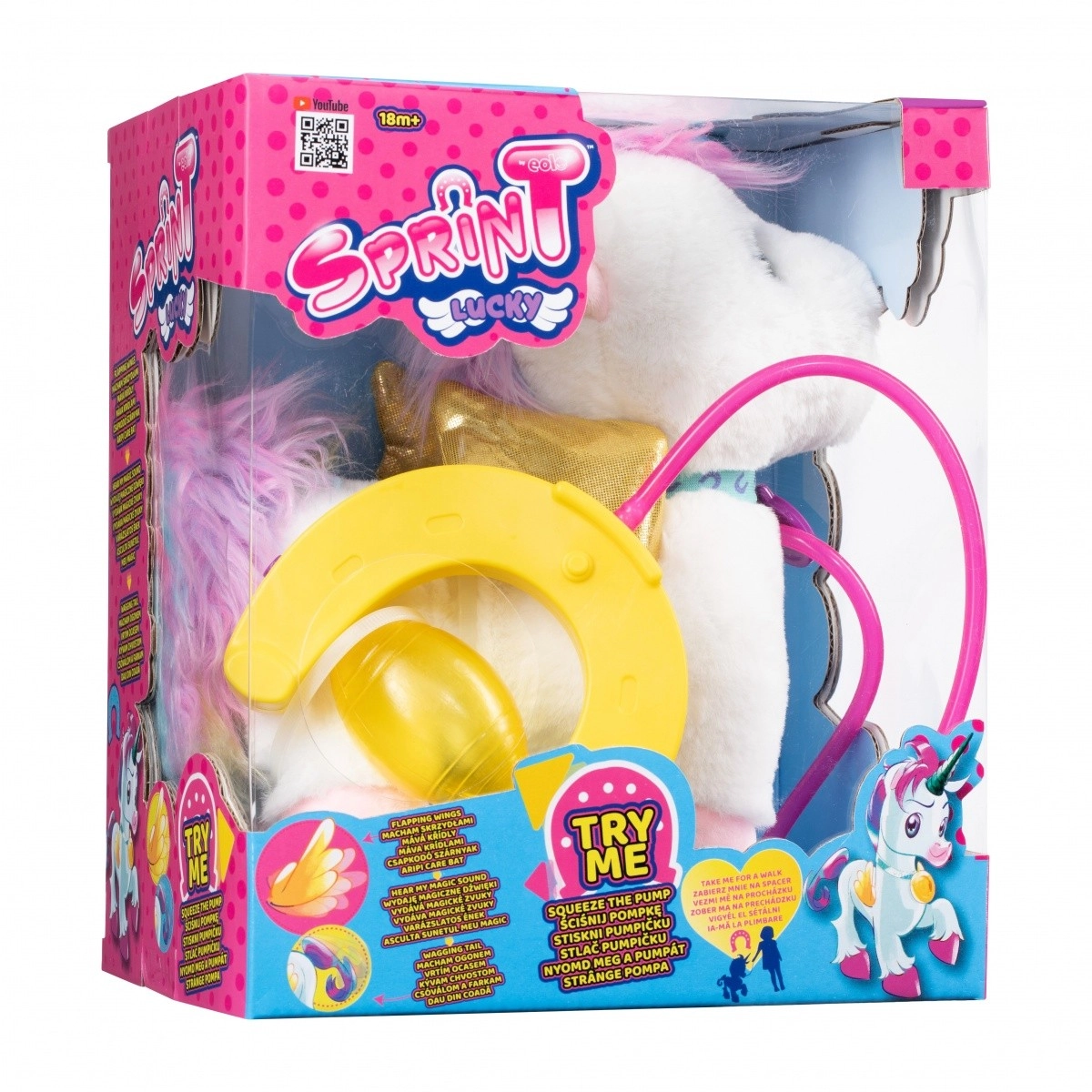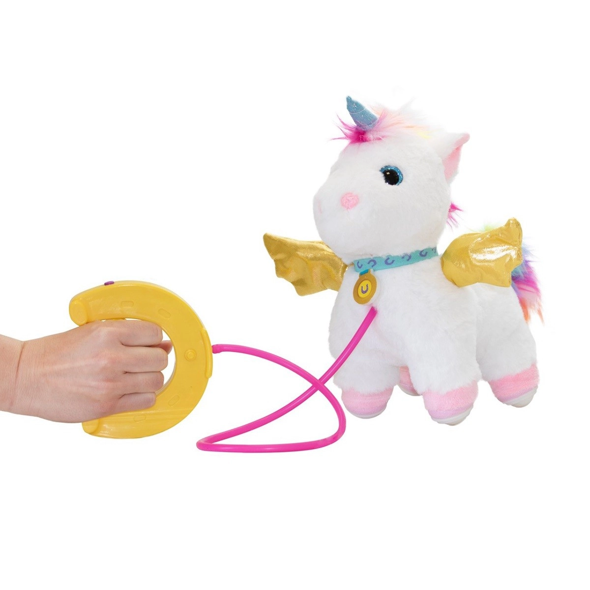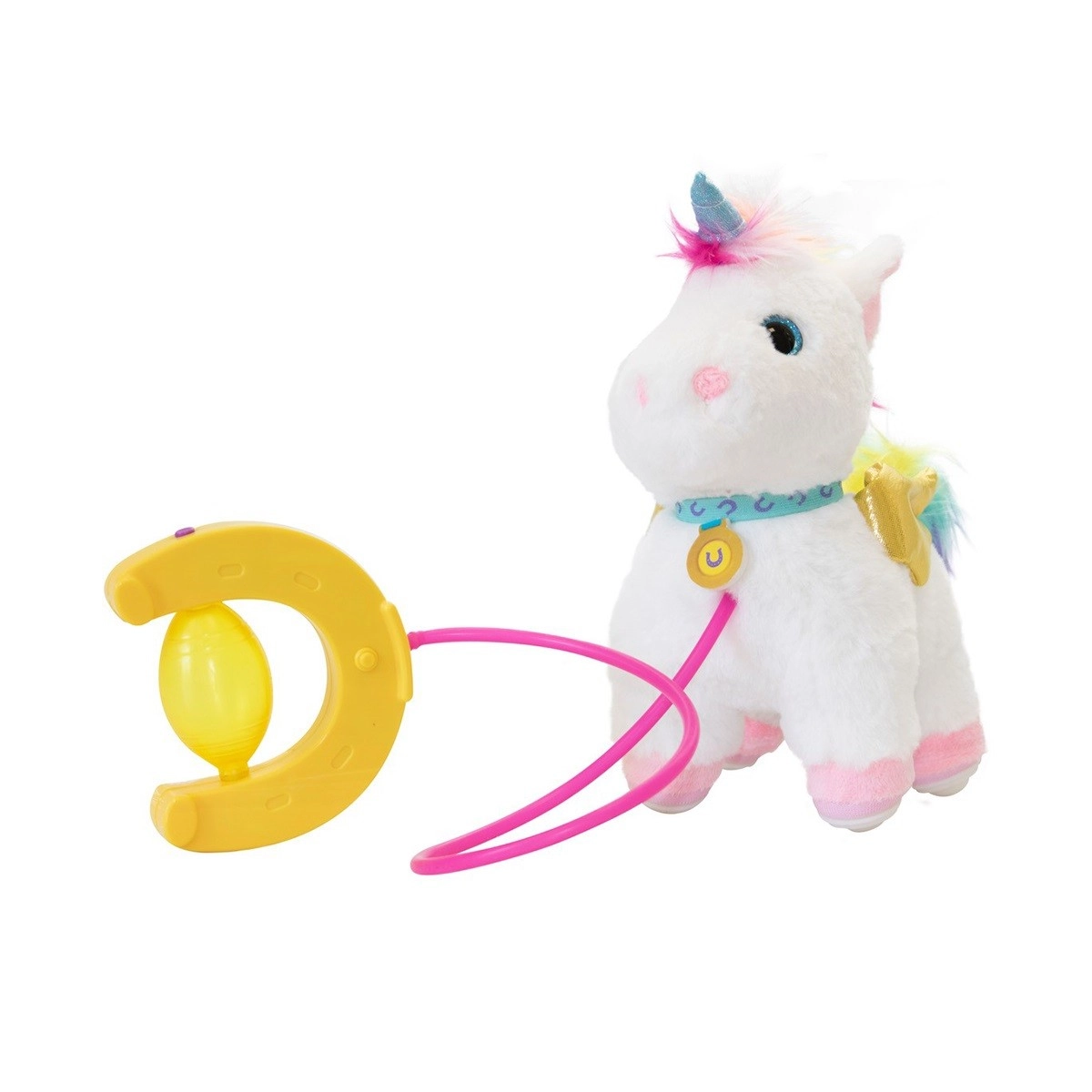 Roztomilý interaktívny jednorožec Lucky poteší každé dieťa – stačí vziať vodítko a plyšák pôjde za vami. Má stabilné nožičky so špeciálnymi guľôčkami pre istý stoj aj pri hraní menších detí. Integrovaná vzduchová pumpička vo vodítku nafukuje uši a chvost a pohybom aktivovaný zvukový čip dodá hre ešte väčšiu zábavu.