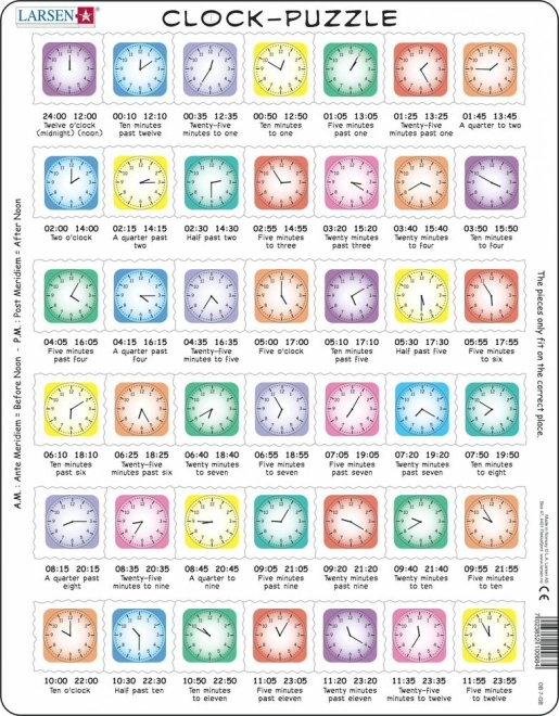 Vzdelávacie puzzle LARSEN s motívom hodín je skvelou pomôckou pre prvé kroky v orientácii v čase. Deti si hravou formou osvoja, kedy je čas na raňajky, obed alebo večeru, a zároveň sa naučia čítať čas na ručičkových hodinách. Kvalitný kartón a pevné dieliky zaručujú dlhú životnosť aj pri opakovanom používaní.