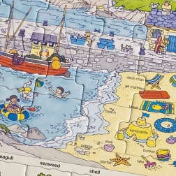 Objavte, čo všetko sa dá nájsť na pláži a naučte sa pomenovať vodné športy prostredníctvom tohto zábavného puzzle. Každý dielik predstavuje rôzne slovo, ktoré treba priradiť k správnemu obrázku na okraji puzzle. Puzzle obsahuje 18 dielikov v strede, ktoré tvoria kompletnú scénu s výučbovými slovíčkami v angličtine. Deti môžu vyhľadať slová na obrázku pre lepšie pochopenie.