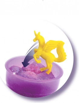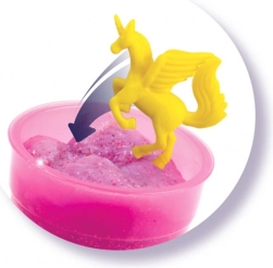 Vytvorte sliz behom pár minút vďaka jednoduchému postupu. Nasypte prášok, pridajte vodu, trblietky a figúrku. Pretrepte a sledujte, ako sliz mení farbu.