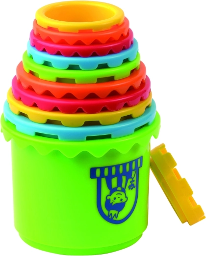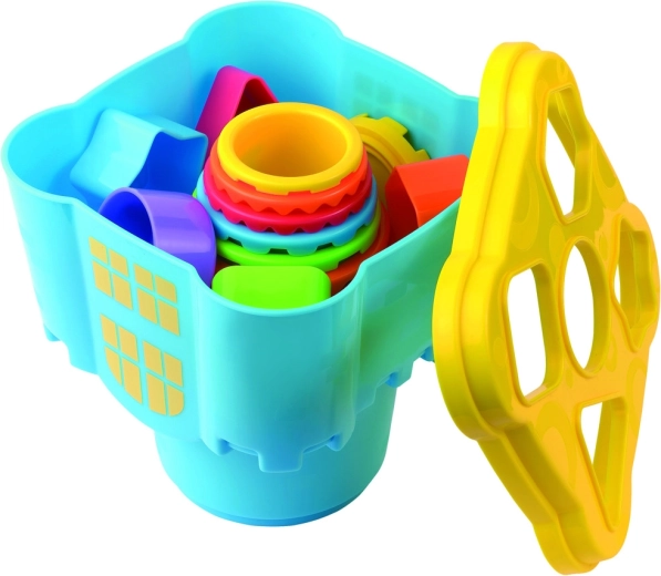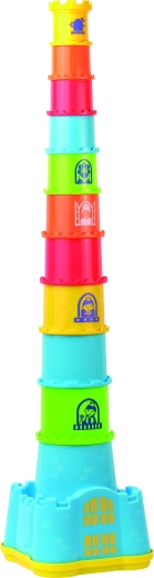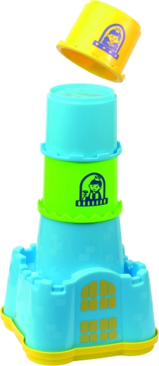 Tento farebný hrad prepája stohovacie poháriky s vedierkom a vekom s tvarmi, takže deti môžu stavať vysokú vežu a zároveň precvičovať vkladanie kociek do zodpovedajúcich otvorov. Hračka rozvíja koordináciu oko–ruka, trénuje trpezlivosť a podporuje predstavivosť pri hraní rolí.
