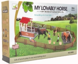 - Výbeh s ohradou, 2 figúrky koní, ošetrovatelia, príslušenstvo na starostlivosť (sedlá, krmivo, čistiace a sprchové doplnky)