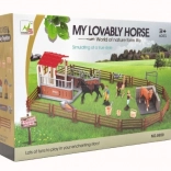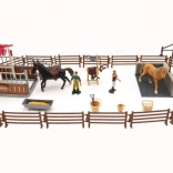 Výbeh s ohradou, 2 figúrky koní, ošetrovatelia, príslušenstvo na starostlivosť (sedlá, krmivo, čistiace a sprchové doplnky)