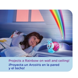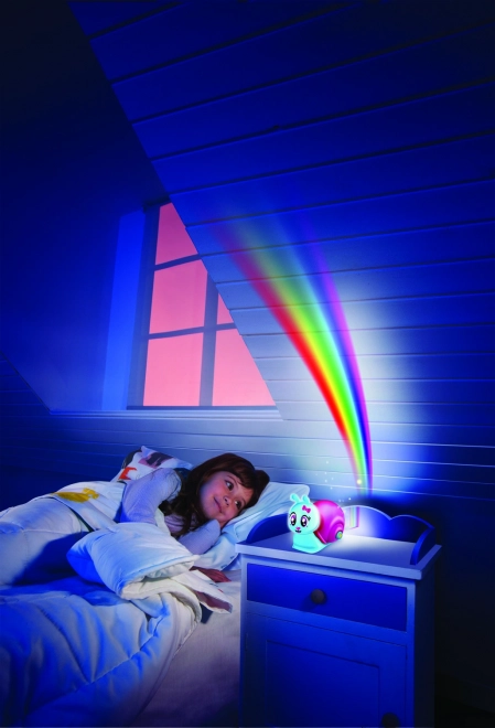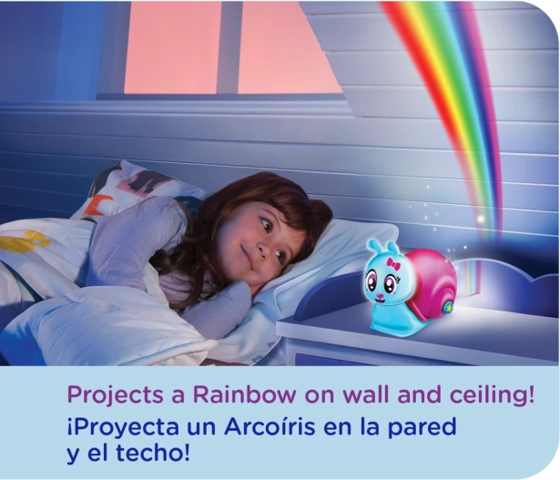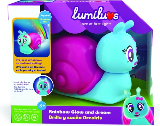 Svetlý a priateľský slimák Lumiluvs je ideálnym spoločníkom pri ukladaní detí do postele. Stačí stlačiť tlačidlo na jeho ulite a na stene a strope sa rozsvieti dúha, čo premení obyčajnú izbičku na čarovné miesto.