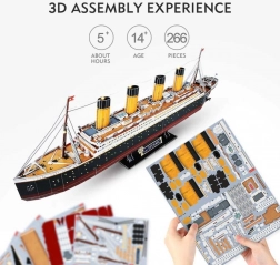 Užite si prepracovanú stavbu legendárneho parníka TITANIC. 3D puzzle s 266 dielikmi od značky CubicFun ponúka realistické detaily a atmosféru zvýraznenú integrovaným LED osvetlením. Diely sú vyrobené z cca 3 mm hrubej peny potiahnutej laminovaným potlačeným papierom – odolné, dobre lícujúce a príjemné na skladanie.