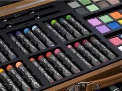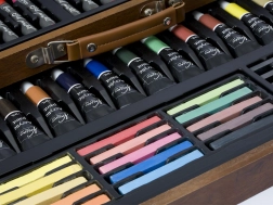 Súprava pre maliarov v drevenom kufríku – drevený rozkladací kufrík obsahuje všetko pre maliarov – farebné kriedy, pastelky, farby, strúhadlo, gumu, štetce atď., celkom 112 ks.