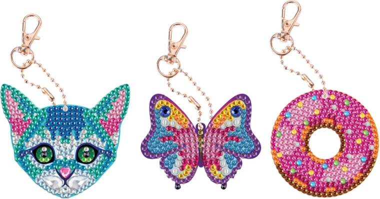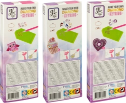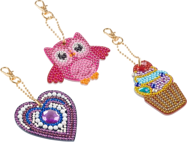 Táto sada vám umožní vytvoriť si tri rôzne prívesky v tvare sovy, zmrzliny a srdca. Každý prívesok je zdobený farebnými kamienkami, ktoré dodávajú vašim kľúčom osobitý štýl.