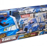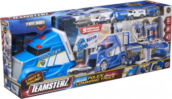 Užite si nekonečné dobrodružstvá s policajnou prepravnou sadou Teamsterz, ktorá obsahuje svetelné a zvukové efekty, funkčný výťah a pumpu a zahŕňa 4 autíčka a helikoptéru.