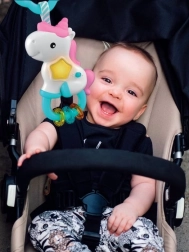 Roztomilý jednorožec od Baby Clementoni je ideálny spoločník na doma aj na cesty. Kombinuje melódie, svetelné efekty a bezpečné hmatové prvky, ktoré prirodzene podnecujú zvedavosť bábätka a rozvíjajú jeho zmysly. Vďaka kompaktným rozmerom si ho vezmete kamkoľvek a ľahko ho upevníte tam, kde naň dieťa najlepšie dosiahne.