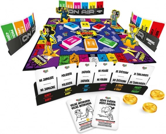- Hracia plocha, 6 sád kariet AKTUALITY, 6 figúrok reportérov, 1 hracia plocha, 1 presýpacie hodiny (30 sekúnd), 6 spravodajských štúdií, návod
