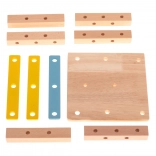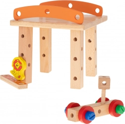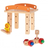 Táto kvalitná drevená sada umožní deťom zostaviť dielenskú stoličku aj ďalšie originálne modely. Vďaka skrutkám, maticiam a ozubeným kolieskam deti skúmajú princípy jednoduchej mechaniky, trénujú sústredenie a zručnosť. Stolička je stabilná a vďaka premyslenému systému otvorov a spojov ponúka množstvo kombinácií.