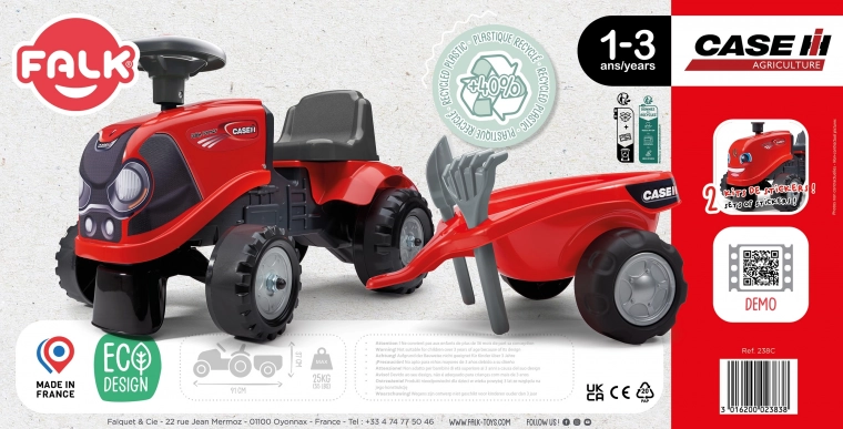 Doprajte malému farmárovi realistickú zábavu s odrážadlom BABY CASE IH. Deti sa ľahko odrážajú nožičkami, trénujú rovnováhu a koordinačné schopnosti, zatiaľ čo vozia poklady v prívesu. Odolné plastové kolesá a robustná konštrukcia zabezpečujú stabilitu a dlhú životnosť.