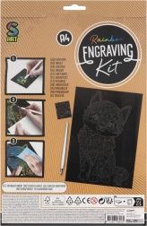 Čierna krycia vrstva sa pri škrabaní mení na živé dúhové farby. Vytvoríte detailný motív mačky bez potreby farieb či lepidiel – stačí priložené pero.