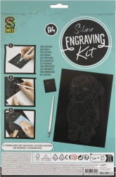V balení nájdete všetko potrebné: obrázok 25 × 20 cm, plastové škrabacie pero s kovovým hrotom a skúšobnú kartičku na nácvik ťahov a textúr.