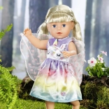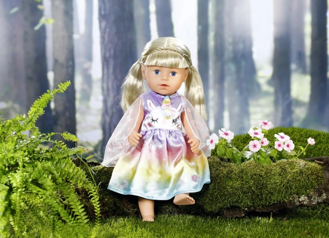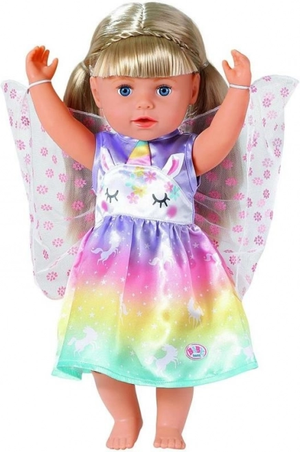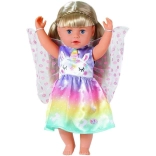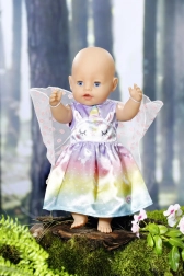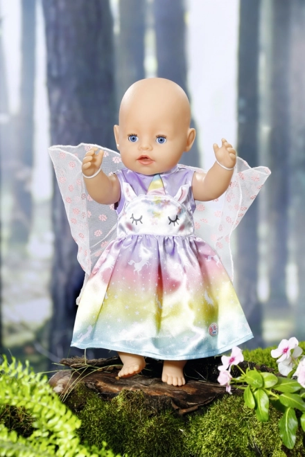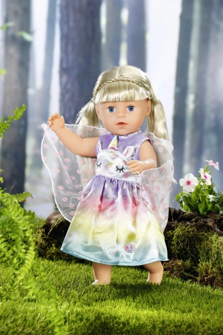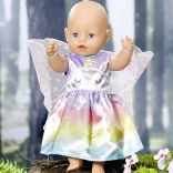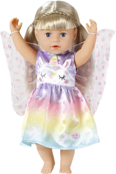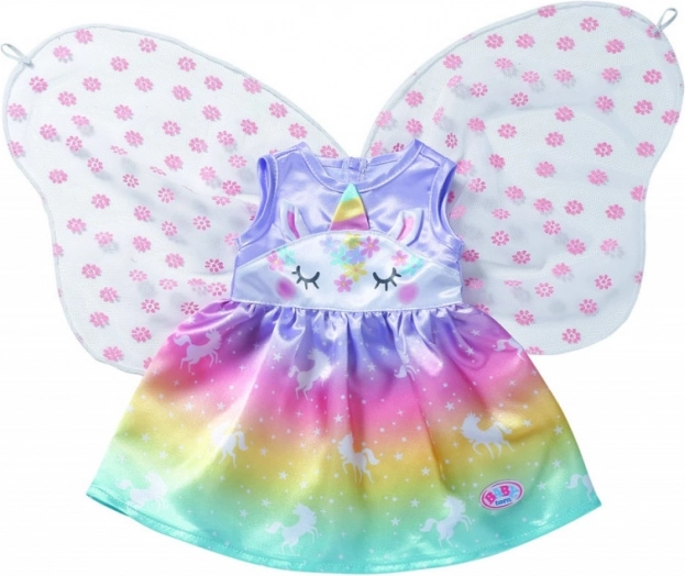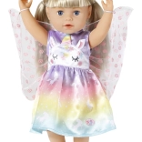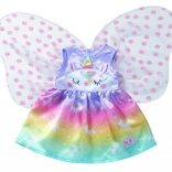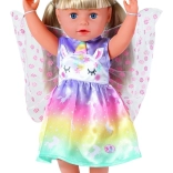 Víly a jednorožce k sebe patria rovnako ako mlieko a sušienky. Vílne šatočky pre bábiku BABY born sú ušité z nádhernej dúhovej látky. Suknička je potlačená čarovnými jednorožcami tancujúcimi po hviezdnej oblohe. Horná časť šatočiek je vpredu ozdobená tváričkou jednorožca s našitými uškami a farebným rohom. Správna víla musí mať samozrejme aj krídelká. Priehľadné krídelká s trblietavými kvietkami sú všité do zadnej časti šatočiek a len čo BABY born prestrčí ruku malým očkom v hornej časti krídeliek, otvoria sa. Originálny oblečok pre bábiky BABY born. Pre nápaditú, rozmanitú a dlhotrvajúcu hru. BABY born Rozprávkový kostým Jednorožec pre bábiky vo veľkosti 43 cm. Súčasťou je ramienko.