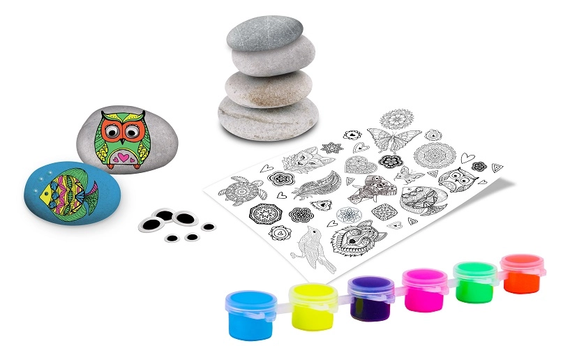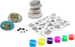 4 kamene, 6 neónových farieb, 1 štetec, 1 drevená špajdľa, 1 arch transferových samolepiek, sáčok s nalepovacími očami a korálikmi