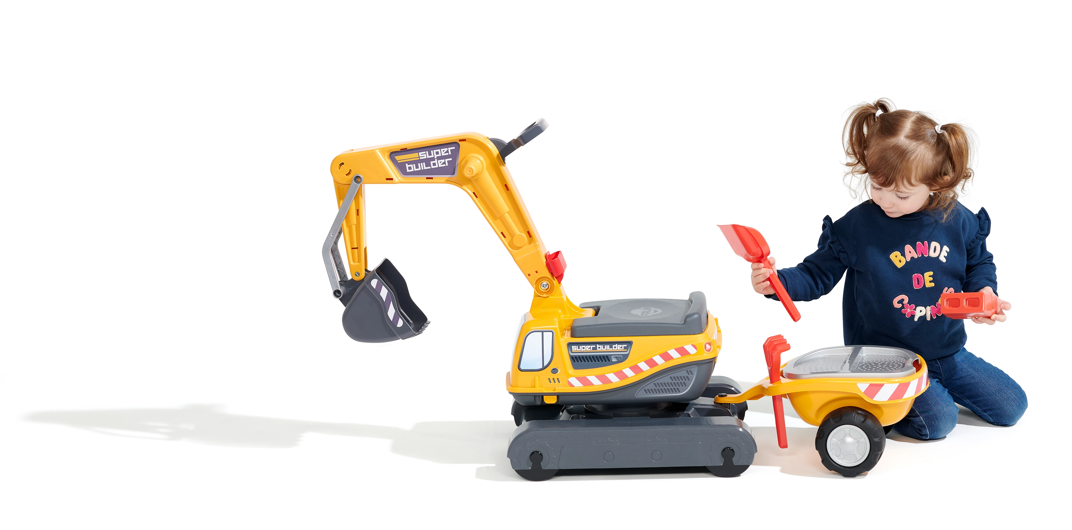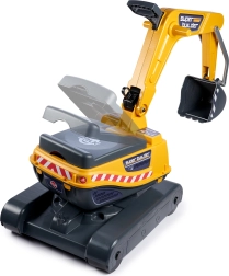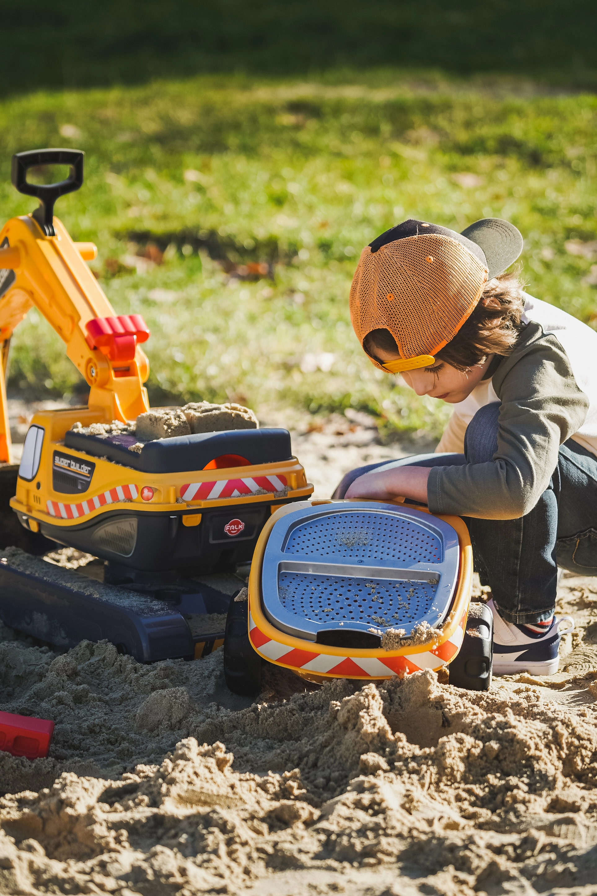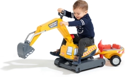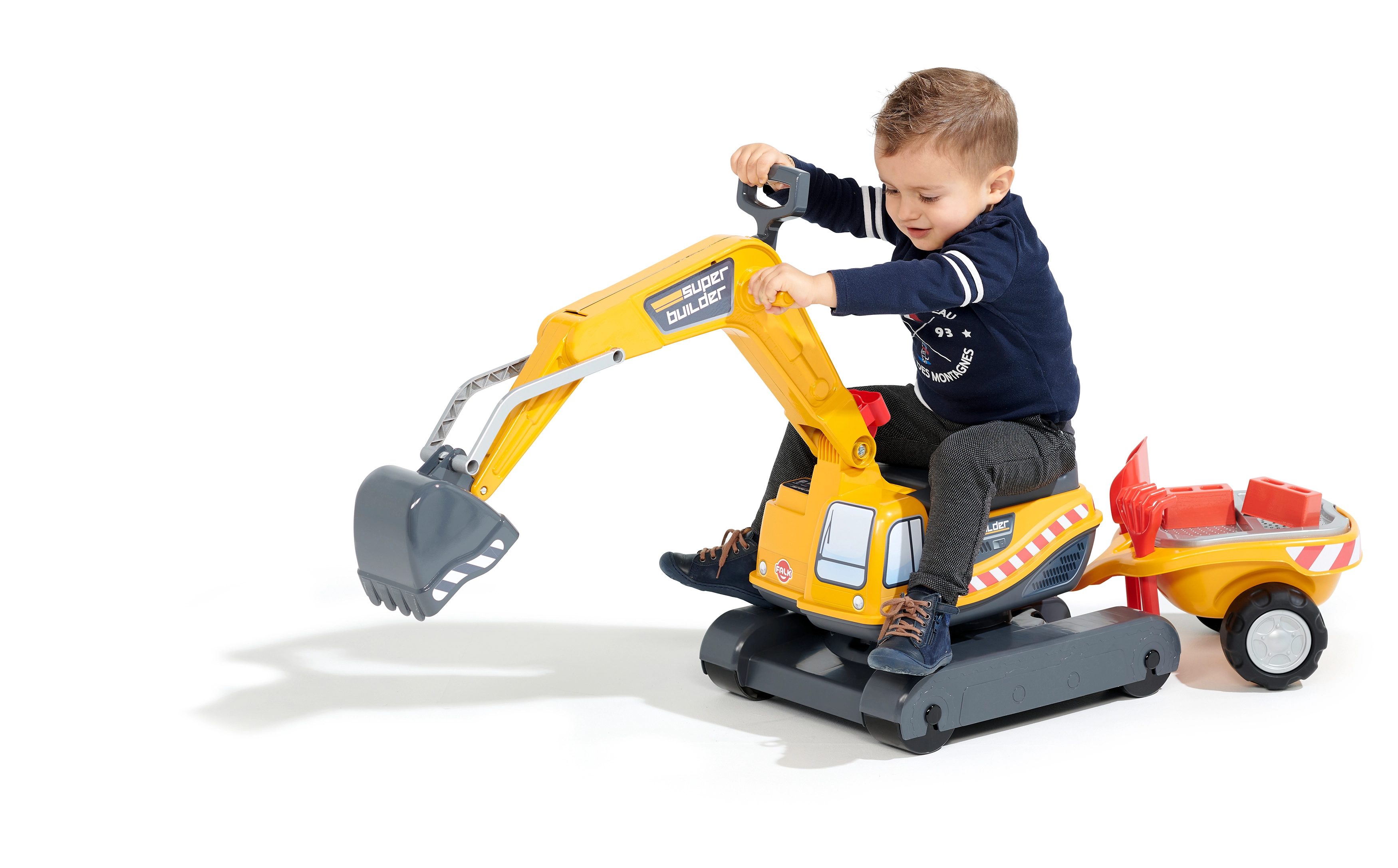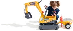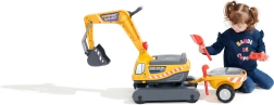 Odrážadlo Super pásový bager oranžový s funkčnou lyžicou, imitáciou pásov, prívesom a hracím setom do piesku – 2× formička v tvare tehly, lopatka a hrabličky. Z vysoko kvalitného a odolného plastu. Veľkosť 85×38×67 cm. Vek 3+. Všetky traktory Falk sú testované na 50 kg – podľa požiadaviek európskych noriem. Vyrobené vo Francúzsku.