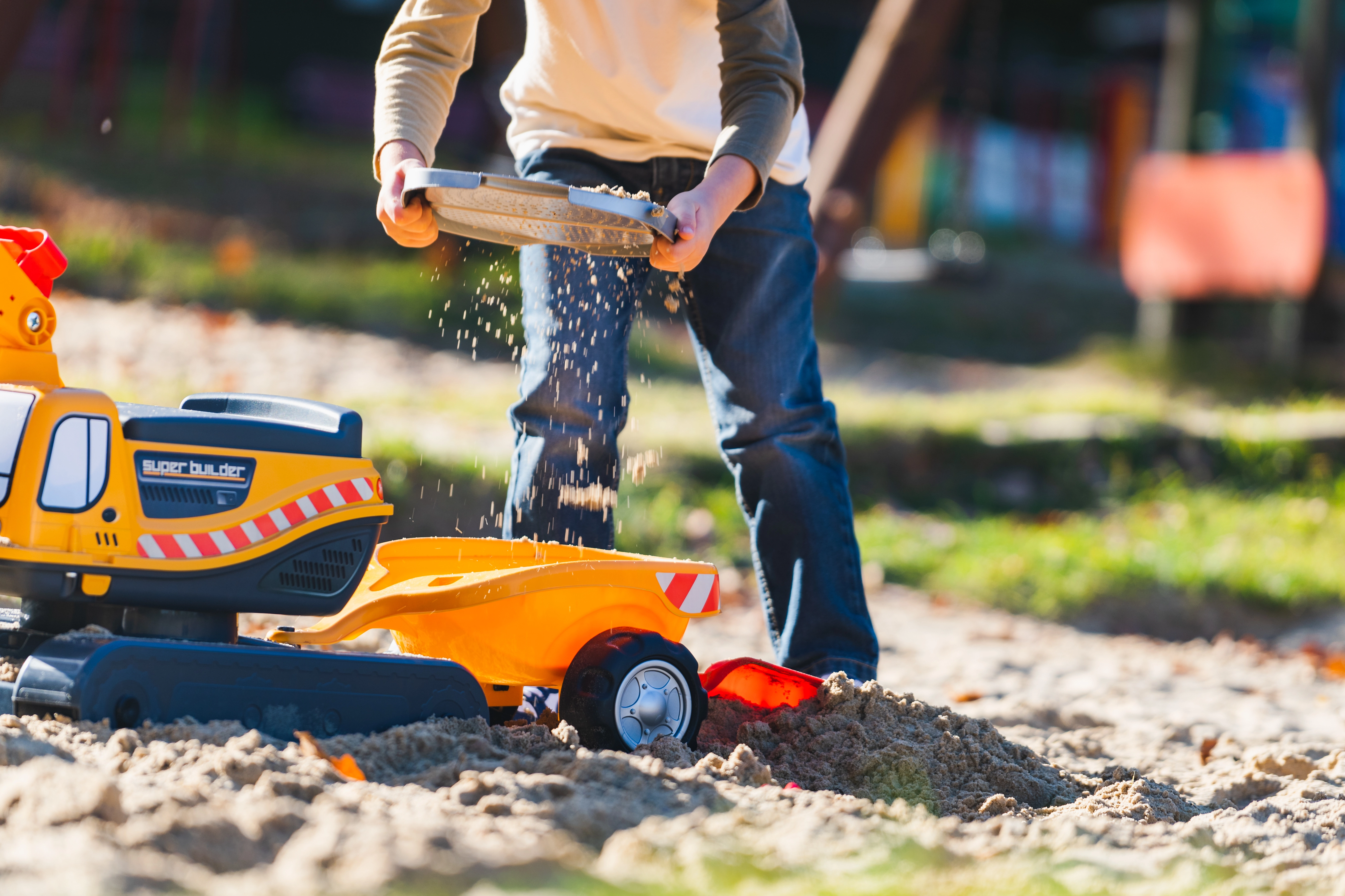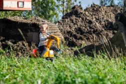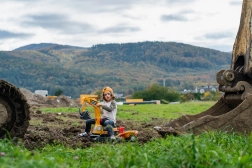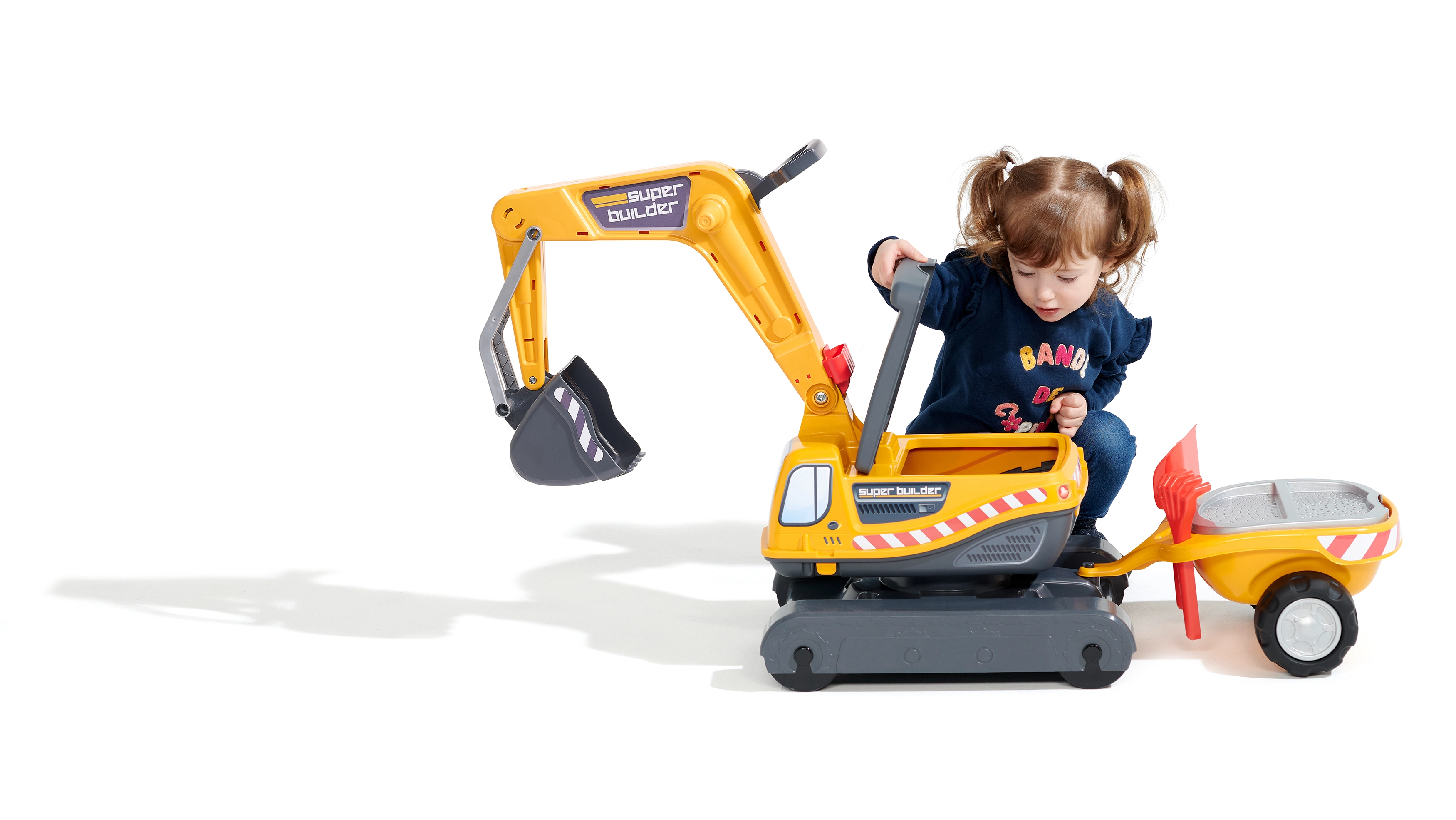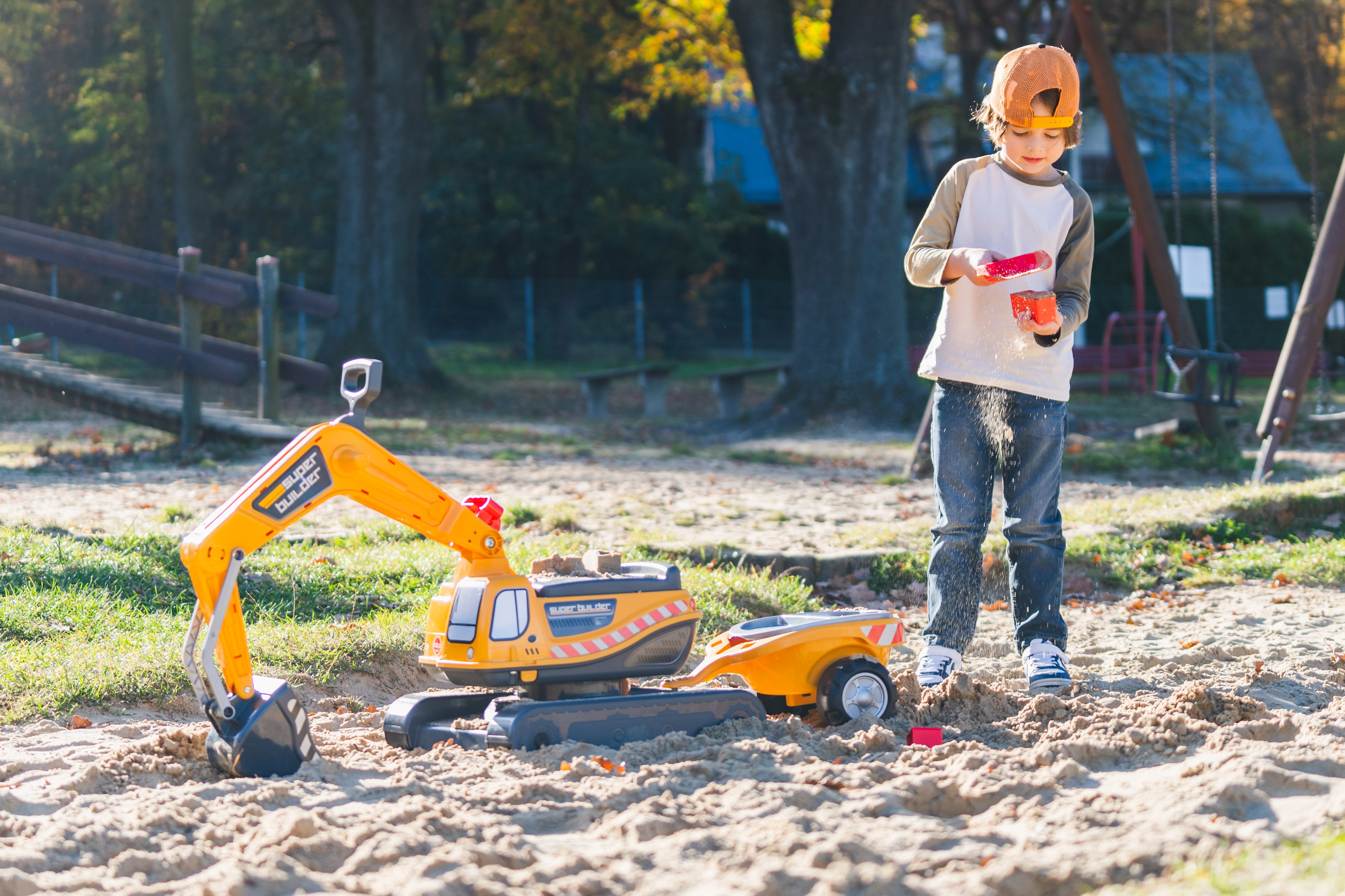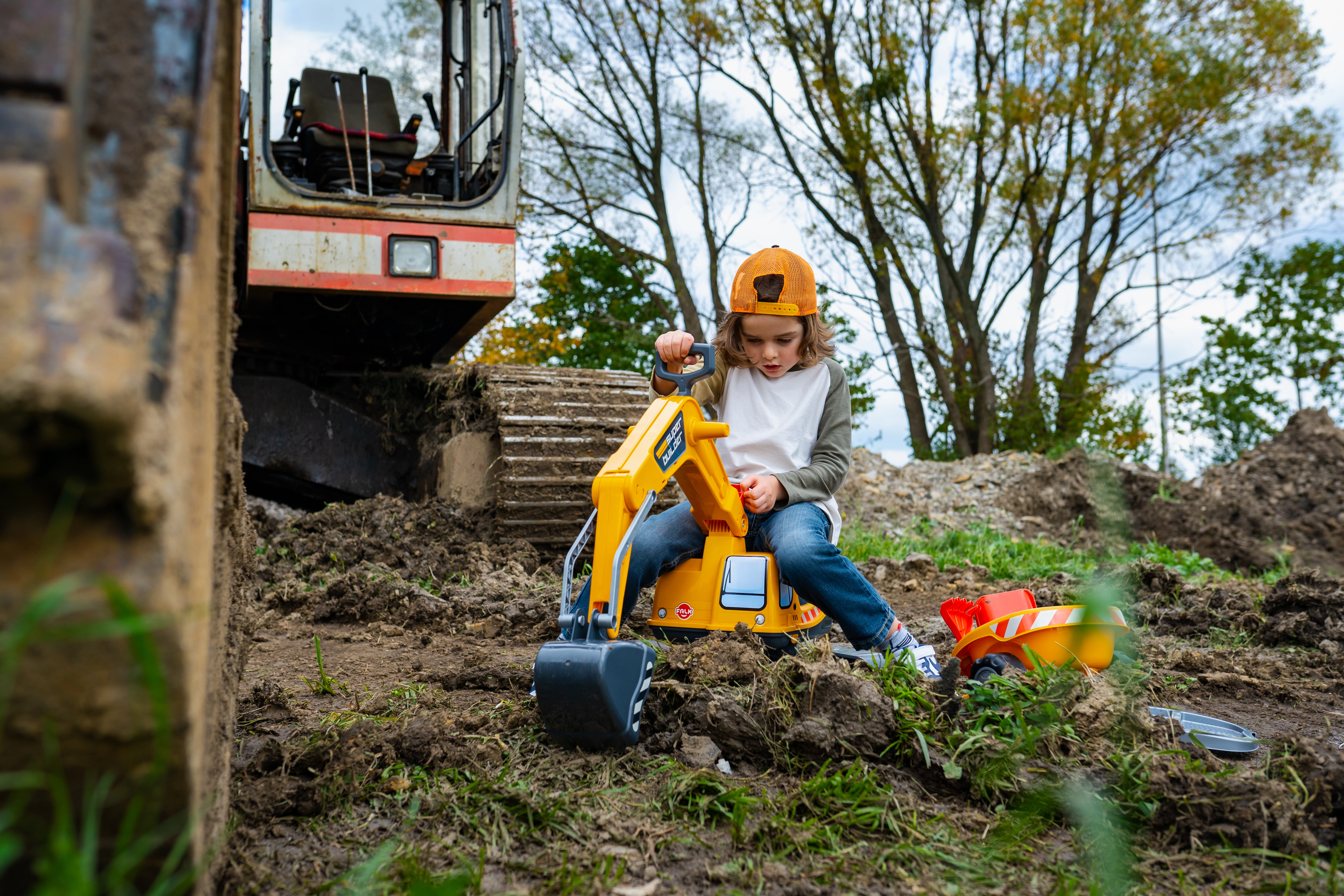 Odrážadlo Super pásový bager oranžový s funkčnou lyžicou, imitáciou pásov, prívesom a hracím setom do piesku – 2× formička v tvare tehly, lopatka a hrabličky. Z vysoko kvalitného a odolného plastu. Veľkosť 85×38×67 cm. Vek 3+. Všetky traktory Falk sú testované na 50 kg – podľa požiadaviek európskych noriem. Vyrobené vo Francúzsku.