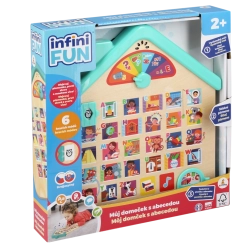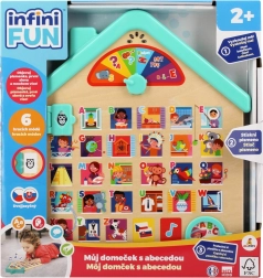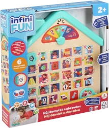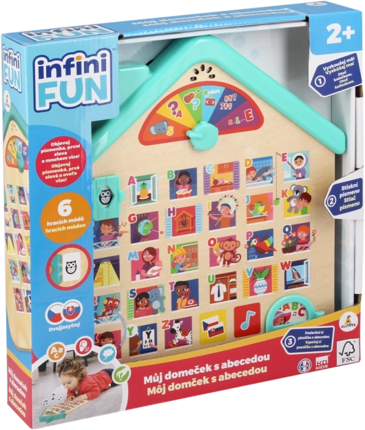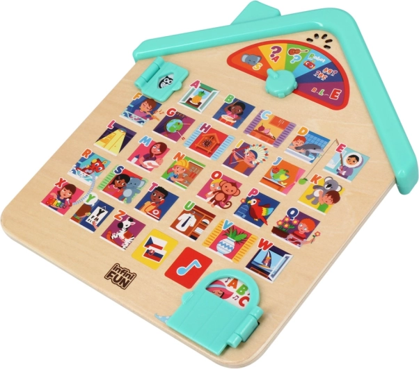 Tento edukatívny drevený domček deti hravou formou zoznamuje s abecedou a základnými slovami. Vďaka hovoreným pokynom v češtine a slovenčine sa deti ľahko orientujú, objavujú písmená a priraďujú ich k veselým obrázkom. Elektronické funkcie na batérie prinášajú zvuky, melódie a radosť z učenia.
