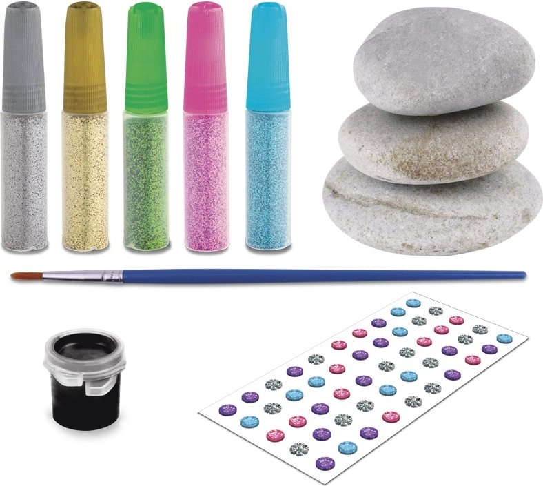 Tri prírodné hladké kamene, štetec, čierna farba, päť metalických odtieňov a trblietavé kamienky – začnite tvoriť hneď po rozbalení.