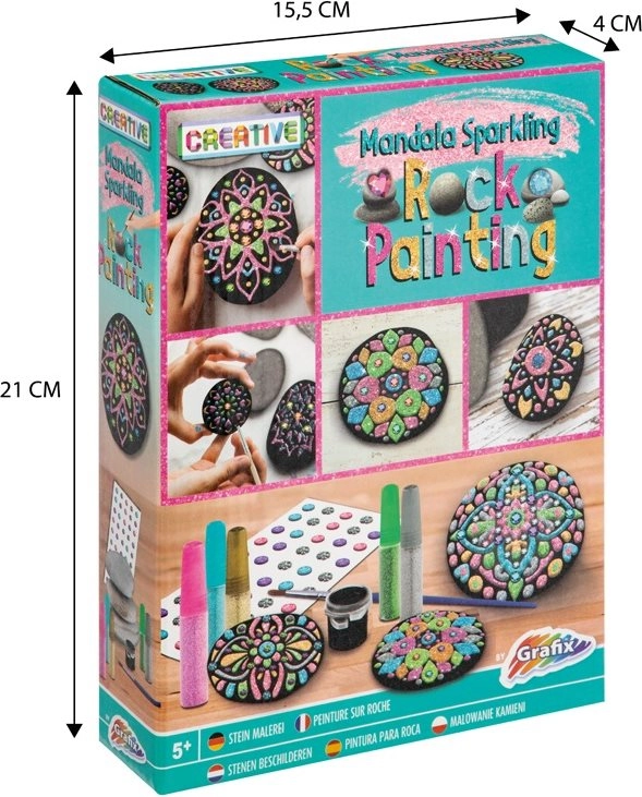 S touto tvorivou sadou ľahko vytvoríte efektné mandalové vzory a žiarivé motívy na hladkých kameňoch. Vďaka kombinácii čierneho podkladu, metalických farieb a samolepiacich kamienkov vyniknú vaše dekorácie výrazným kontrastom a trblietkom. Maľovanie na kamienky je skvelý spôsob, ako si oddýchnuť a zároveň vyrobiť krásne darčeky či doplnky do bytu a na záhradu.