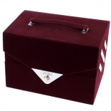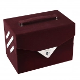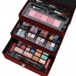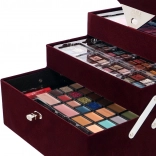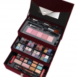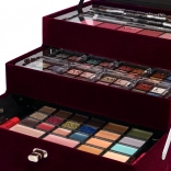 Kozmetický kufrík zamatový Beauty Case Velvety – zamatový tmavo vínový – spolu 74 ks príslušenstva. Obsahuje 32× očné tiene v 4 kompaktných kazetách, 5× lícenku, 3× tiene na obočie, 1× vosk na obočie, 4× krémové očné tiene, 4× krém s trblietkami, 2× základné očné tiene, 8× korektor, 2× lesk na pery, 1× rúž, 1× riasenku, 1× obojstrannú ceruzku na oči, 1× obojstrannú ceruzku na pery, 1× štetec na lícenku, 1× obojstranný štetec na tiene, 4× obojstranný aplikátor, 1× integrované zrkadielko. Dermatologicky testované, spĺňa prísne normy EÚ.