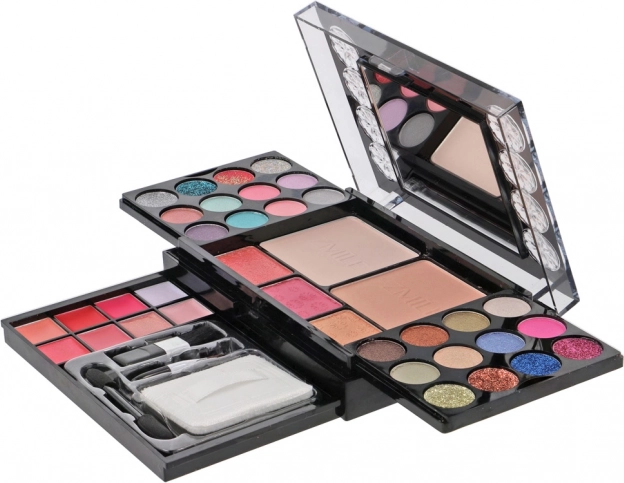 - 16× očné tiene, 8× krémový lesk na pery, 8× krém s flitrami, 2× púder, 1× aplikátor/štetec (3v1), integrované zrkadielko