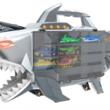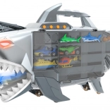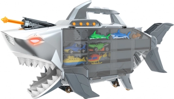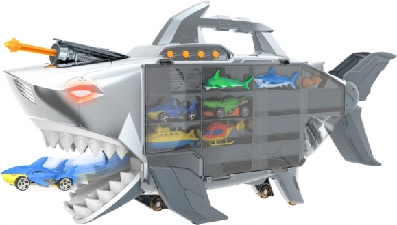 Vydajte sa na dobrodružstvo so žraločím transportérom, ktorý pojmе až 24 autíčok a ponúka svetlá, zvuky a otváracie čeľuste. Vďaka rukoväti a kolieskam je ľahko prenosný, nechýba rýchlostná rampa a odpaľovač rakiet ani bohaté príslušenstvo na okamžitú hru.