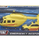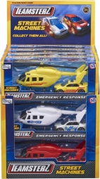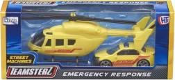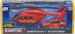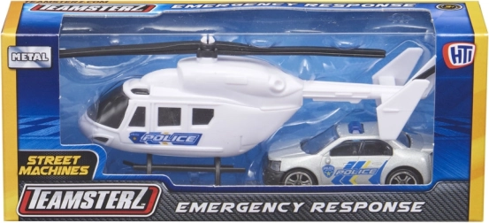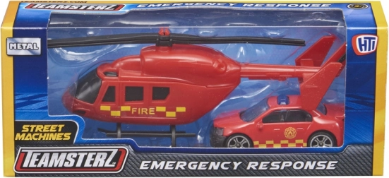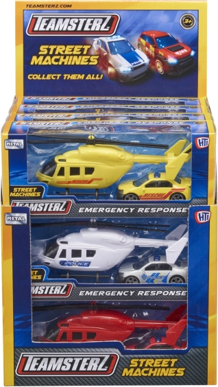 Sada TEAMSTERZ spája zábavu a odolnosť: detailne spracovaný vrtuľník s ručne otáčanými listami a akčné zásahové auto s voľnobežnými kolesami. Vďaka kovovému (tlakovo liatemu) skeletu a kvalitným plastovým dielom si deti užijú realistickú hru na políciu, hasičov aj záchranárov.