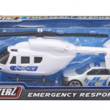 Biely policajný vrtuľník a hliadkové auto s modrými prvkami inšpirujú k prenasledovaniam a zásahom. Ideálne na tréning koordinácie a tímovej spolupráce pri hre.