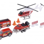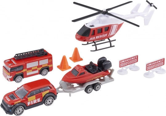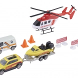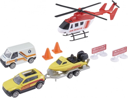 - Balenie obsahuje: vrtuľník, zásahové vozidlo, 4×4 s ťažným zariadením, čln alebo vodný skúter s odnímateľným prívesom, dopravné kužele a núdzové značky.