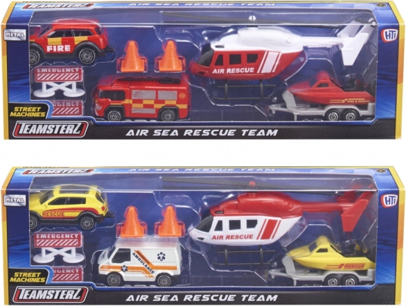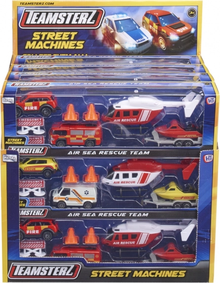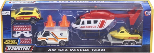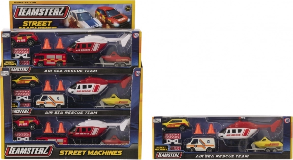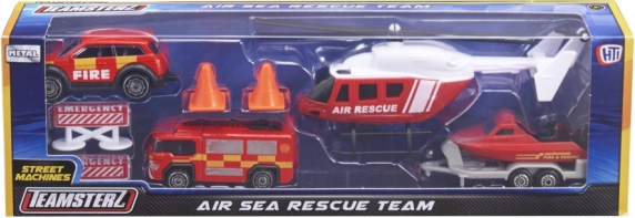Pripravte sa na vlastné záchranné misie na súši aj na vode so sadou Teamsterz! Nájdete v nej liaty vrtuľník s ručne otáčanými listami, zásahové vozidlo, 4×4 s ťažným zariadením, čln s prívesom a núdzové doplnky. Kvalitná tlakovo liata karoséria a voľne bežiace kolesá zaručia hodiny nápaditej zábavy pre deti od 3 rokov.