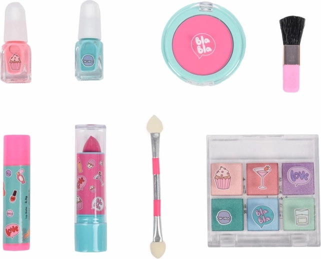 - 2× lak na nechty, krieda na vlasy, veľký štetec, balzam na pery, rúž, malý obojstranný štetček, 6× trblietavý očný tieň