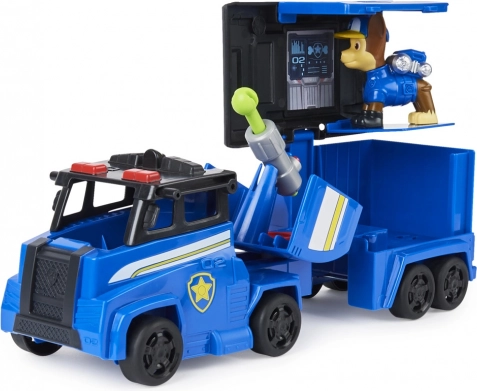 Vozidlo Paw Patrol Big Trucks Chase sa premení na mobilnú jazdu centrum, ktoré odhaľuje odpaľovače tenisových loptičiek a kazety.